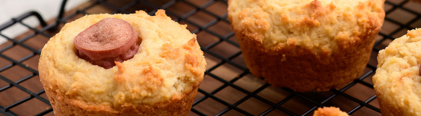 Incorpora la mezcla de mantequilla a los ingredientes secos, bate hasta que todo quede bien incorporado. Llena cada uno de los moldes para muffins hasta 3/4 de su capacidad. Sumerge un pedazo de salchicha en el medio.